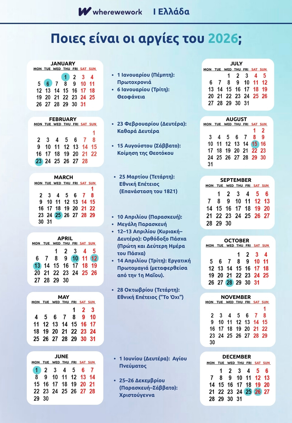 Από αυτές, 2 πέφτουν σε Σαββατοκύριακο (15 Αυγούστου – Σάββατο, 26 Δεκεμβρίου – Σάββατο) και δεν προσθέτουν επιπλέον ελεύθερο χρόνο για όσους έχουν κλασικό ωράριο Δευτέρα–Παρασκευή. Οι υπόλοιπες 11 πέφτουν εντός της εβδομάδας, προσφέροντας σταθερές ευκαιρίες για ξεκούραση.